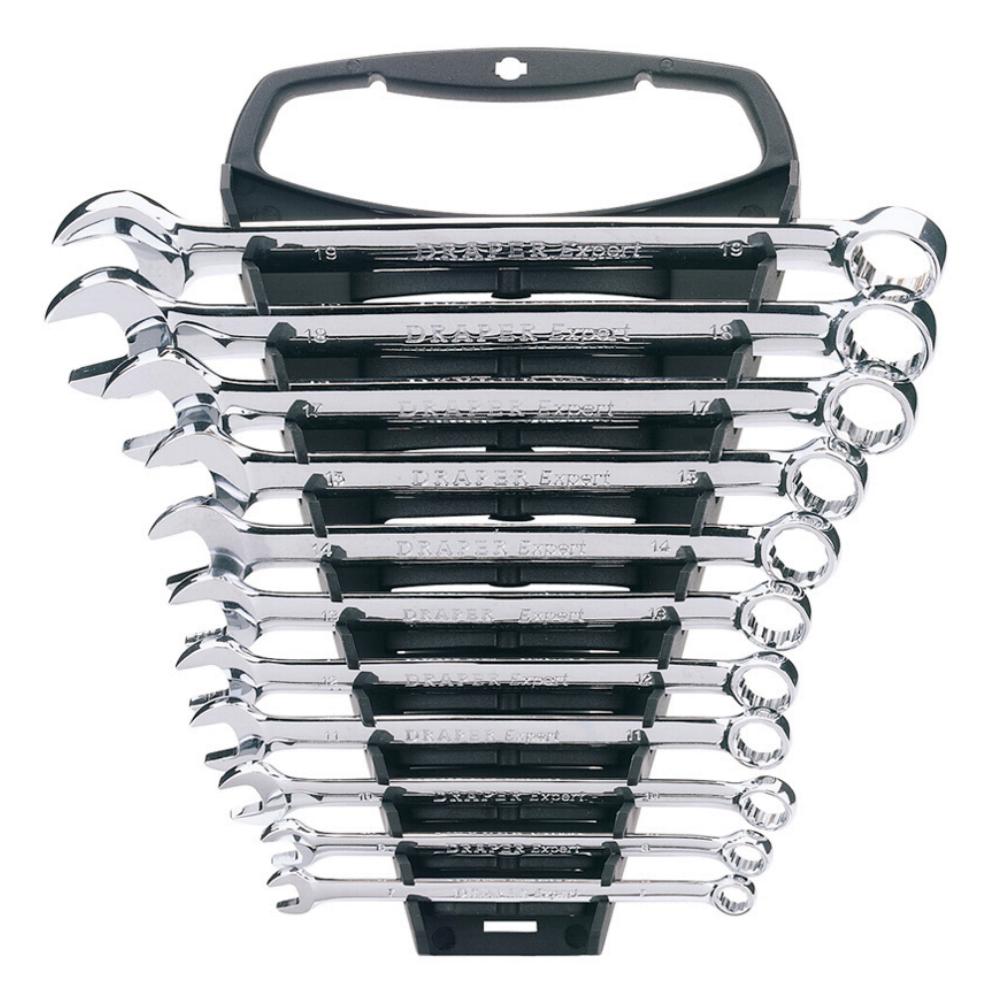 Expert Quality, with Draper Expert Hi-Torq ring end cranked at 15°. Forged from chrome vanadium steel hardened, tempered, chrome plated and fully polished throughout. Supplied on wall mountable plastic storage rack.